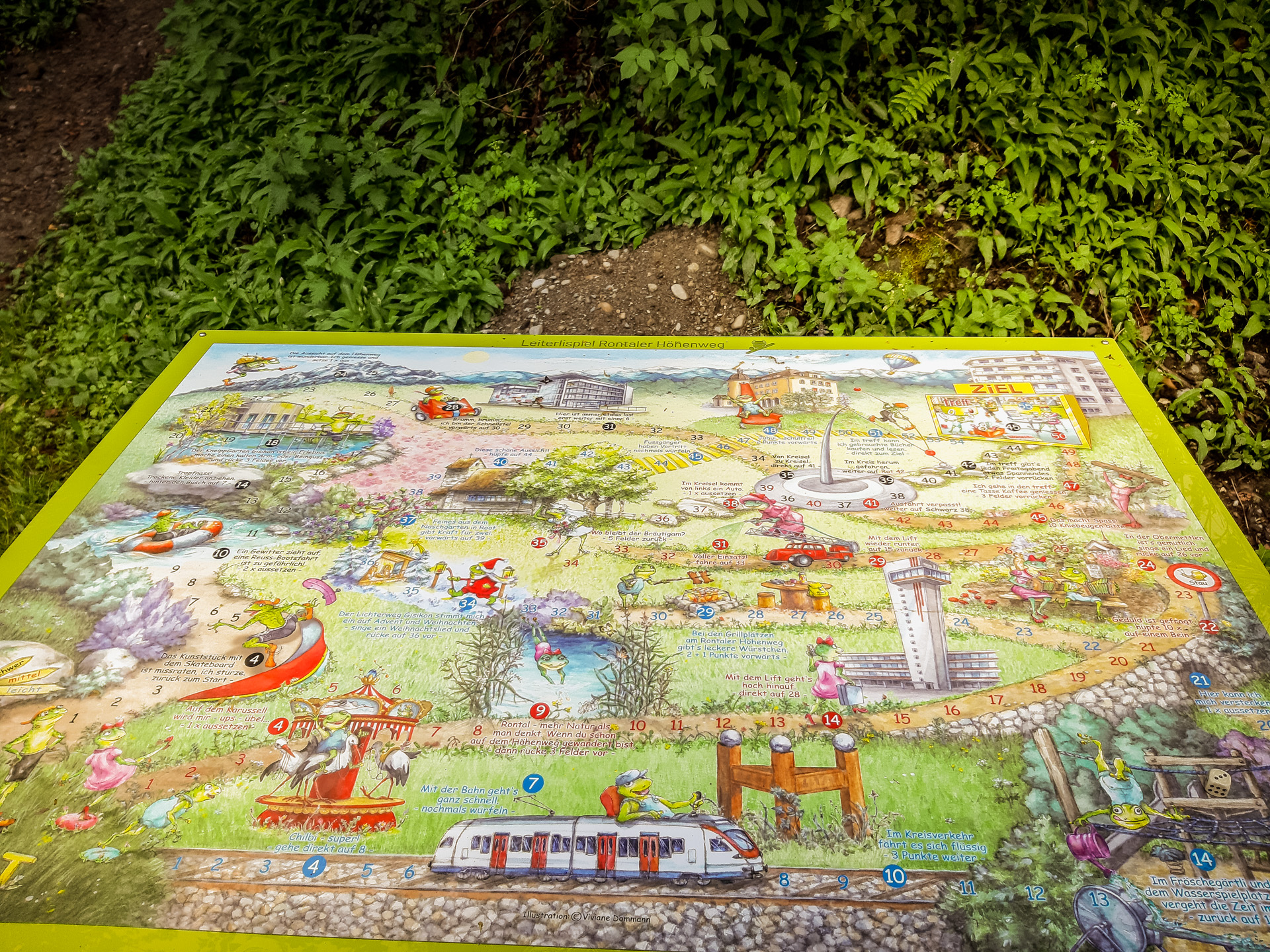 Bei der Feuerstelle in Gisikon entdecken Sie das «Rontaler Leiterlispiel». Mit Würfel (geht auch mit dem Handy) und Spielfiguren (Steine und Holzschnitzel) lernen Sie das Rontal und seine Attraktionen auf ganz neue Art und Weise kennen. Mit viel Liebe zum Detail hat Viviane Dommann, Bilderbuch-Illustratorin aus Meilen, diese Leiterlispiel mitentwickelt.