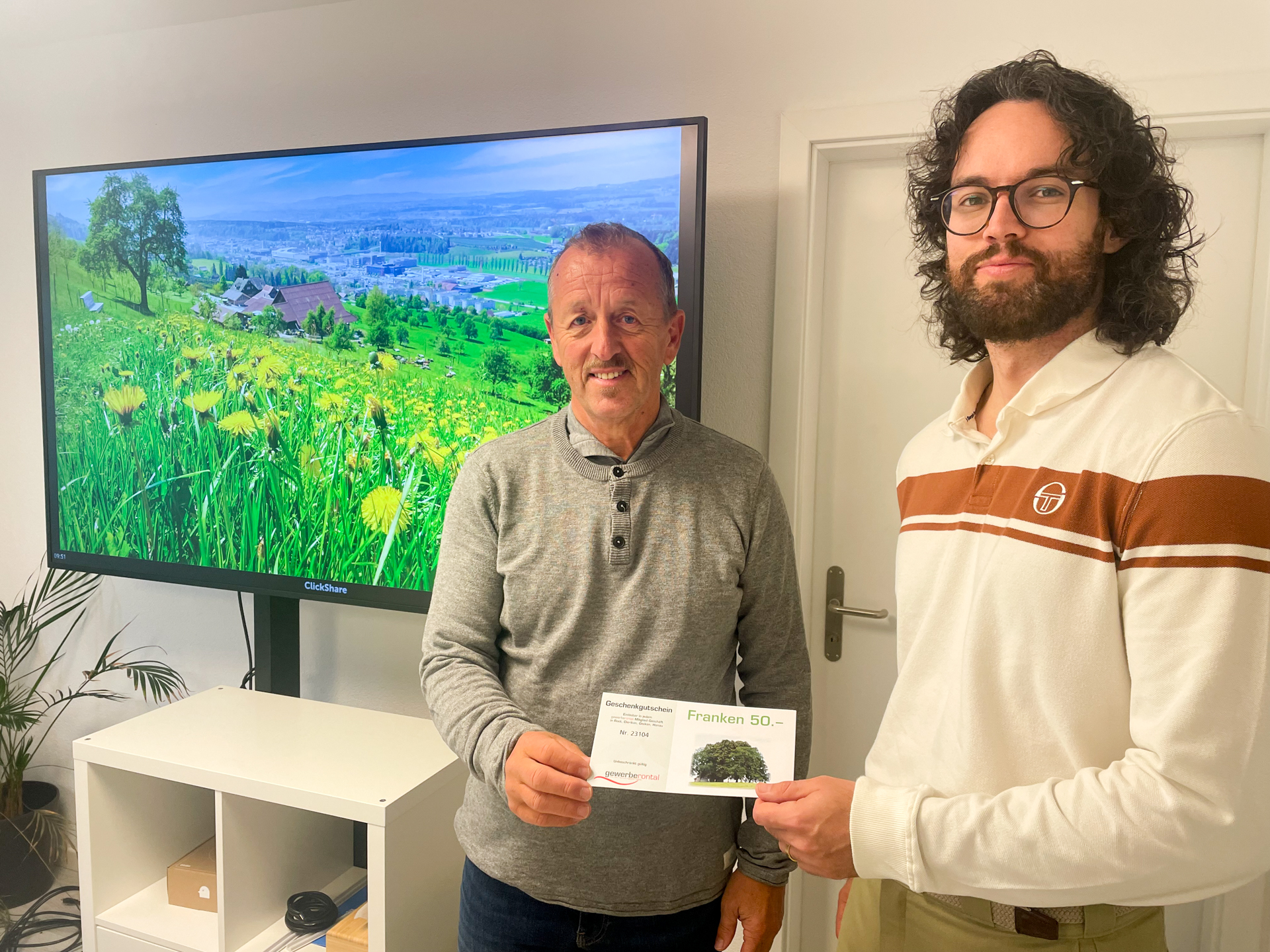 Alle drei Gewinner erhielten Wertgutscheine des Gewerbe Rontal im Gesamtwert von CHF 350. Diese Gutscheine können in zahlreichen regionalen Geschäften, Restaurants und Dienstleistungsbetrieben eingelöst werden – ein Preis, der Freude bereitet und gleichzeitig das lokale Gewerbe stärkt.