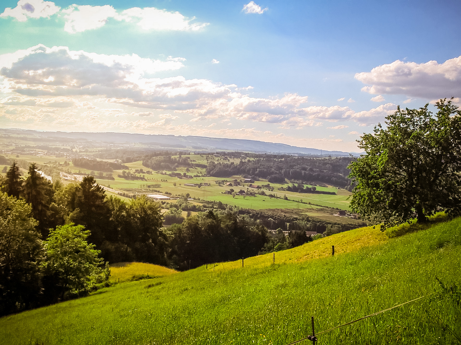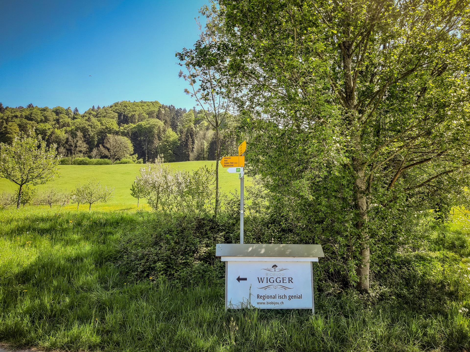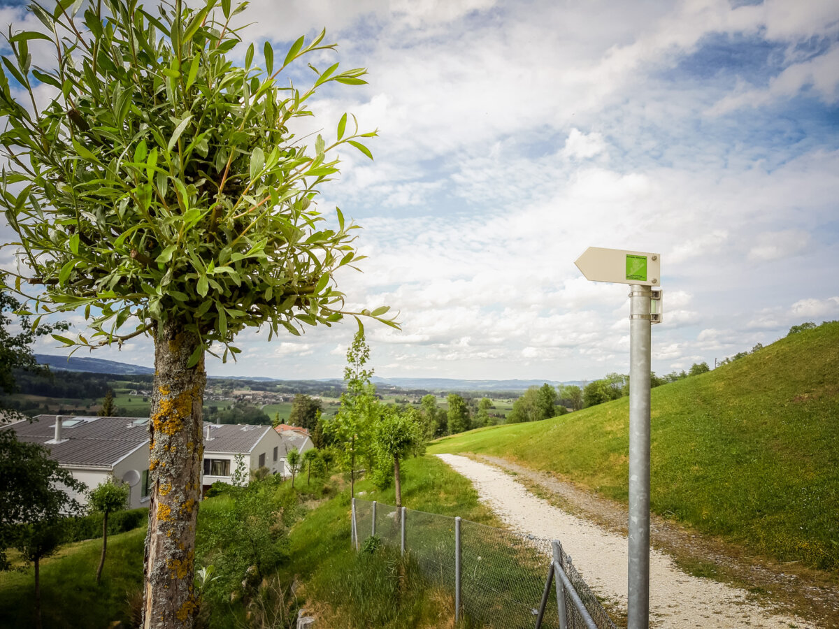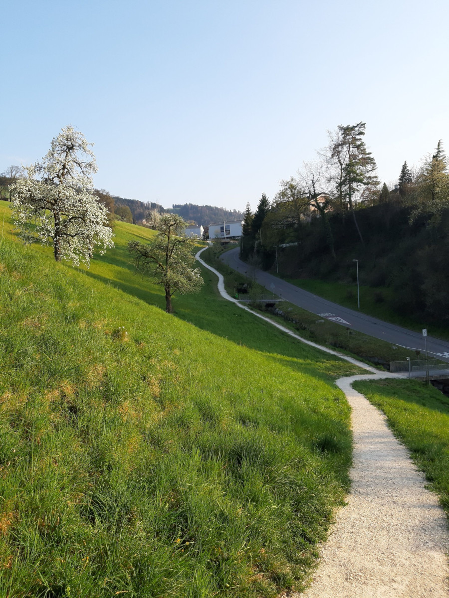Frisch gestärkt geht es aufwärts zum Grenzbach. Auch hier gilt es ein Tobel zu überqueren. Während gut einer Stunde geht es jetzt durch den Mischwald am Rooter Berg mit vielen unterschiedlich grünen Tönen. In der Waldlichtung Bäumliweid steht ein grösszügiger Picknickplatz mit Feuerstelle zur Verfügung, mit Sicht über das Mittelland. Wenn wir wieder aus dem Wald treten, sind wir beim Hof Obermettlen angekommen. In einem Hüttchen stehen kühle Getränke zur Selbstbedienung. Für Gruppen werden Hofführungen und weitere Attraktionen angeboten. Ebenaus gelangen wir zu einem kleinen Wäldchen, wo der Weg nach links in einen Waldweg führt. Hier gibt’s eine sympathische Überraschung. Wanderstöcke stehen nämlich bereit, damit man den relativ steilen Abstieg mühelos bewältigen kann. Unten werden sie wieder deponiert – für umgekehrt Wanderne. Zusätzlich ist die Treppe am Schluss des Abstiegs mit einem Geländer gesichert.