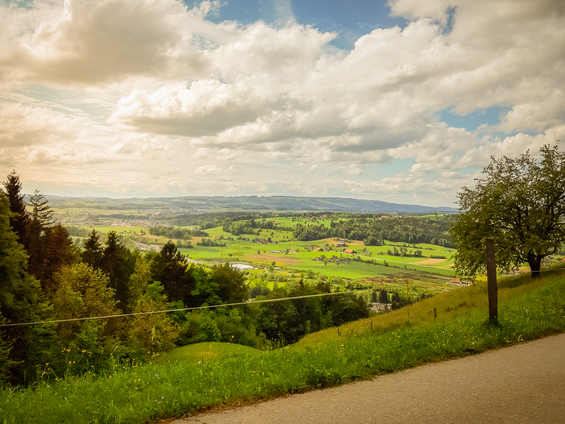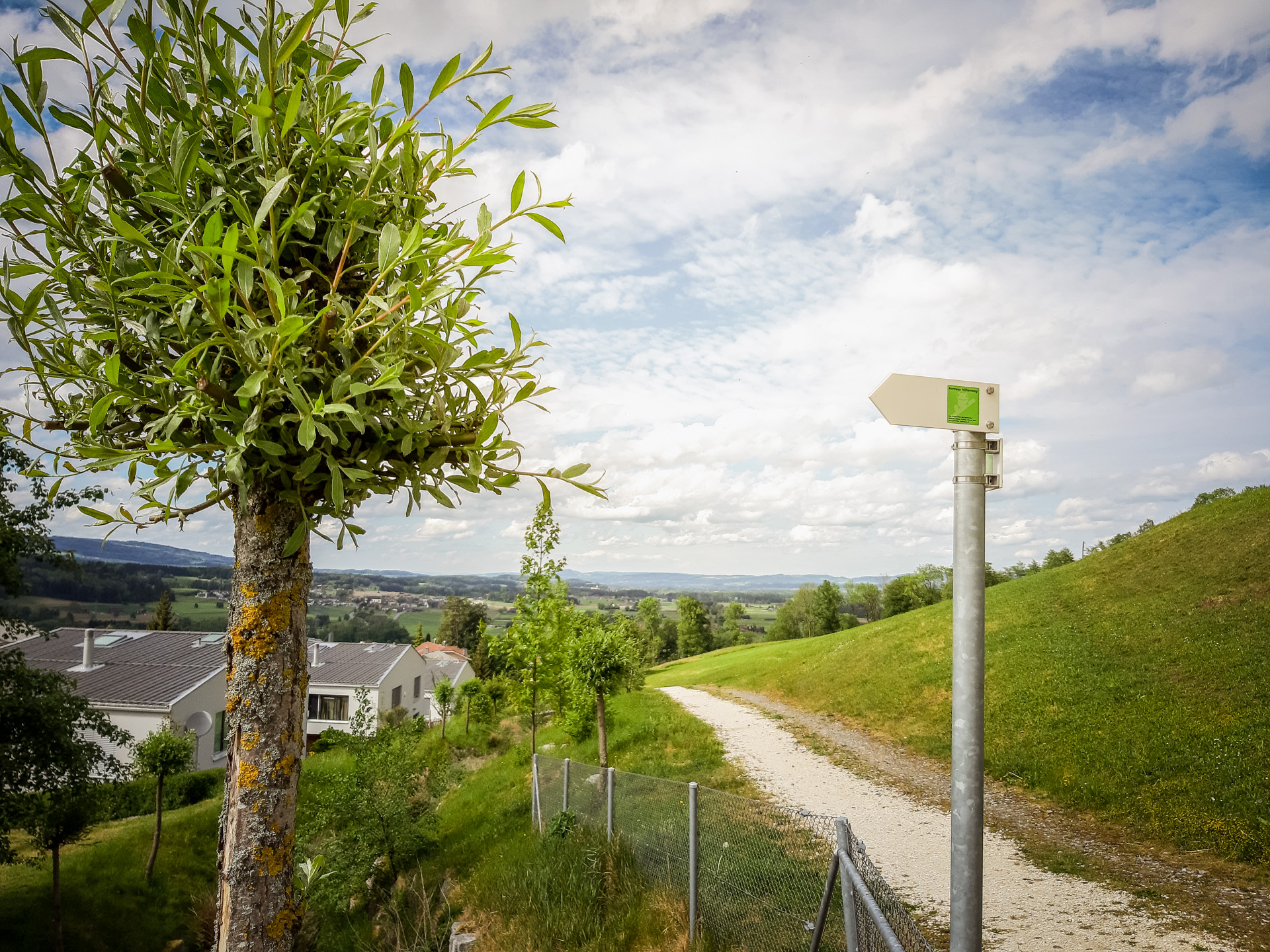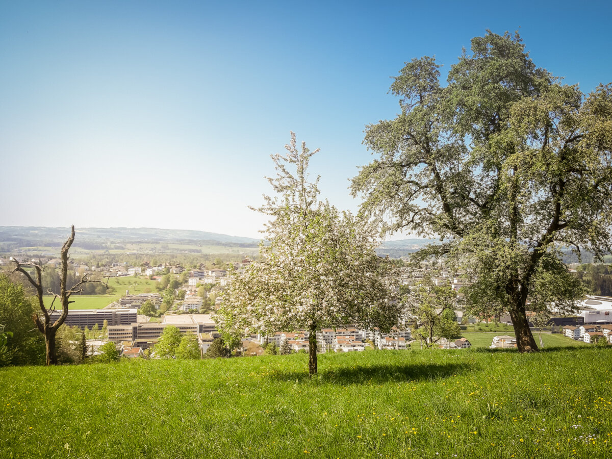 Auf grasigen Wegen geht es nun zu schönen und gepflegten Schrebergärten beim Gartenareal Rütihof. Nun folgt das Schlössli Ebikon. Hier könnte man den Bus besteigen. Wir schlendern durch den Weiler Rütimatt (mehrere Richtungswechsel) und überqueren dann das romantische Sagetobel. Dann geht es aufwärts durch eine Einfamilienhaussiedlung bis wir in einem Wäldchen landen und schon bald die wunderbare Sicht auf die imposante Rigi geniessen dürfen. Jetzt folgen wunderbare Abschnitte über Wald und Weiden, vorbei am Biotop Unteräbrüti und gelangen dann zum Hof Neufildere. Neben dem Schopf gibt es Getränke. Hier genehmigen wir uns einen Kaffee und einen feinen Kuchen. Im halbgedeckten Bistro hat man eine tolle Sicht ins Tal. Auch die Mall of Switzerland ist in ihrer ganzen Grösse zu bestaunen.